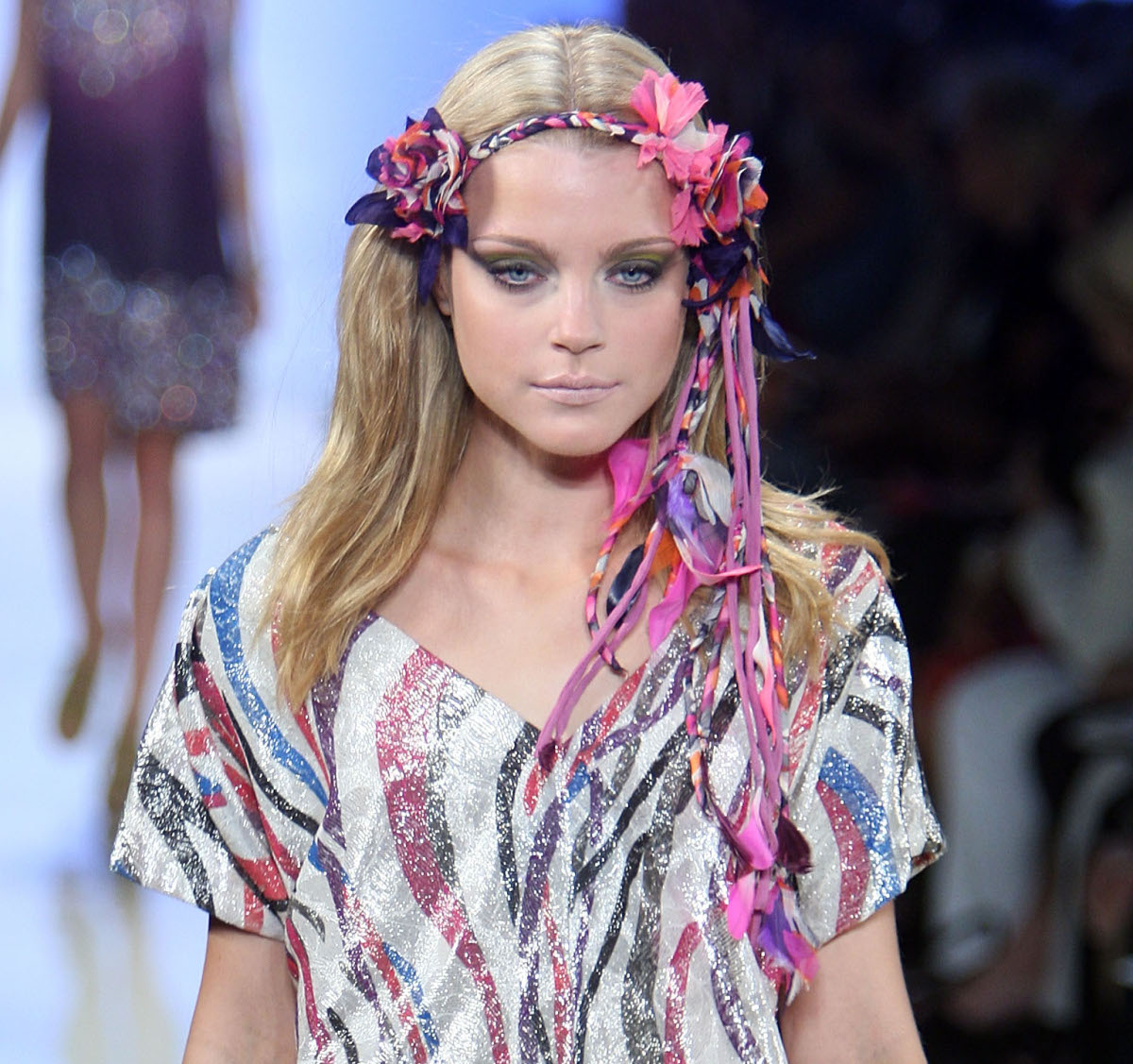 Ribbons and beads and curls galore. I can see music buffs braiding coloured ribbons into their chilled out coifs at festivals all over the world. Granted they’re not going to have access to hot curlers but accessorising with brightly coloured ribbons and beads seems very carefree and chilled out-look to Diane von Furstenberg for inspiration.